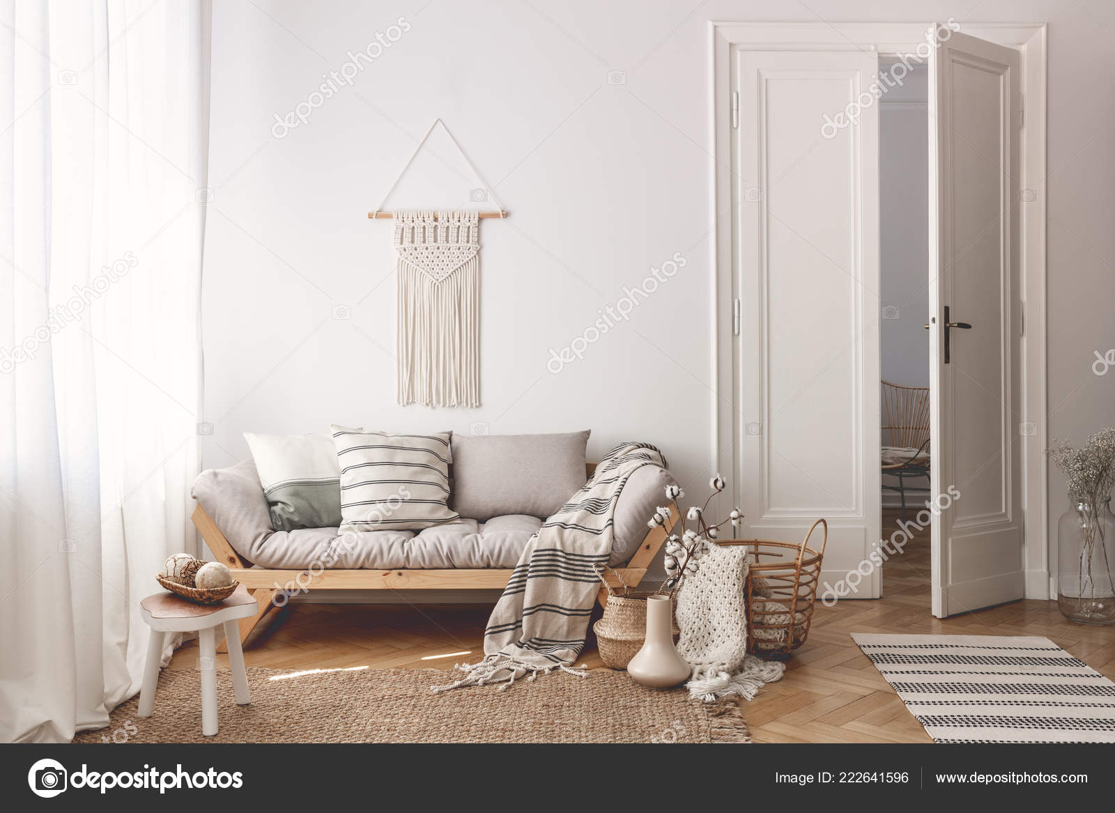 Living Room Stylish Macrame Sofa Wooden Accessories Doors Open